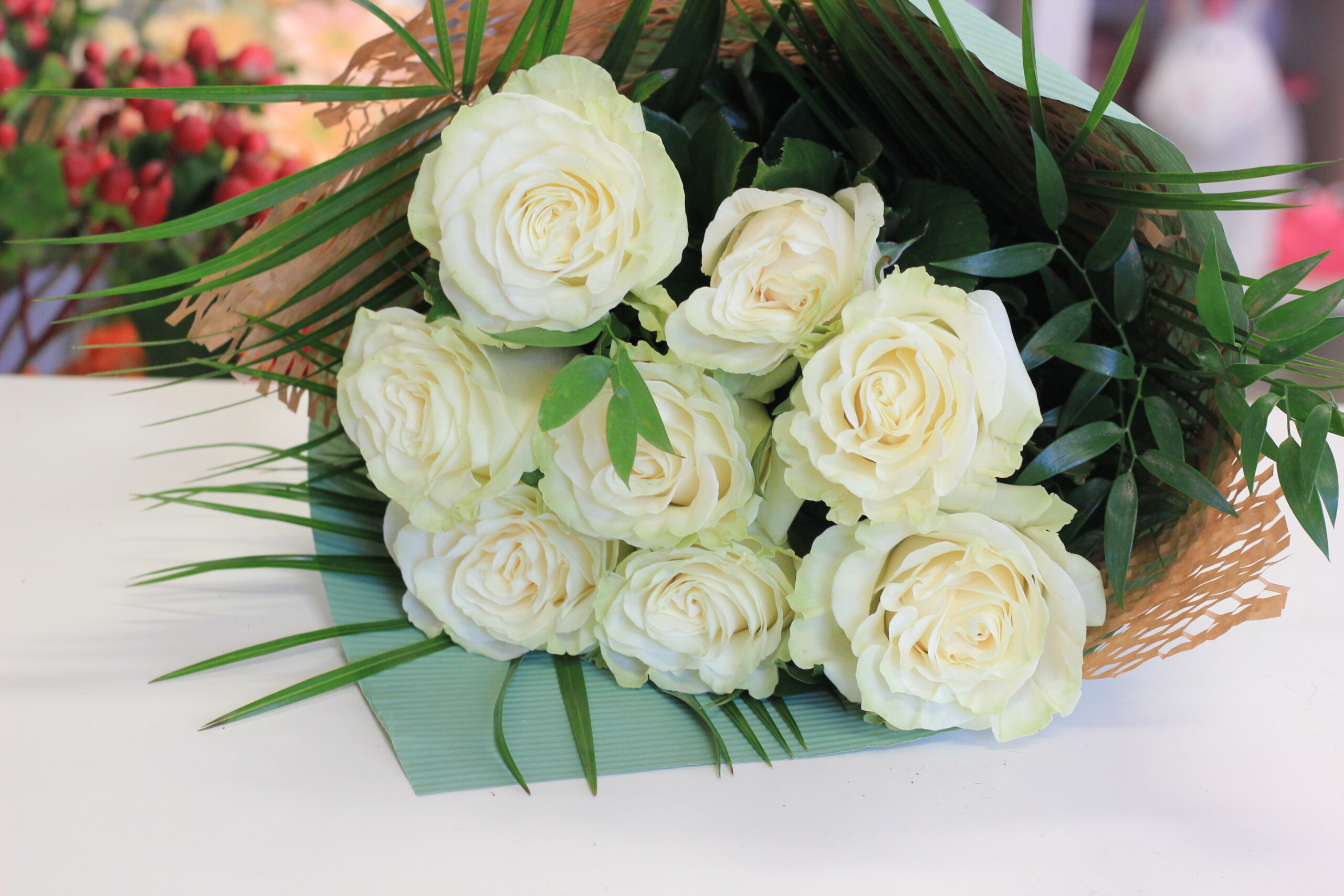 Hosszú szárú fehér rózsa csokor